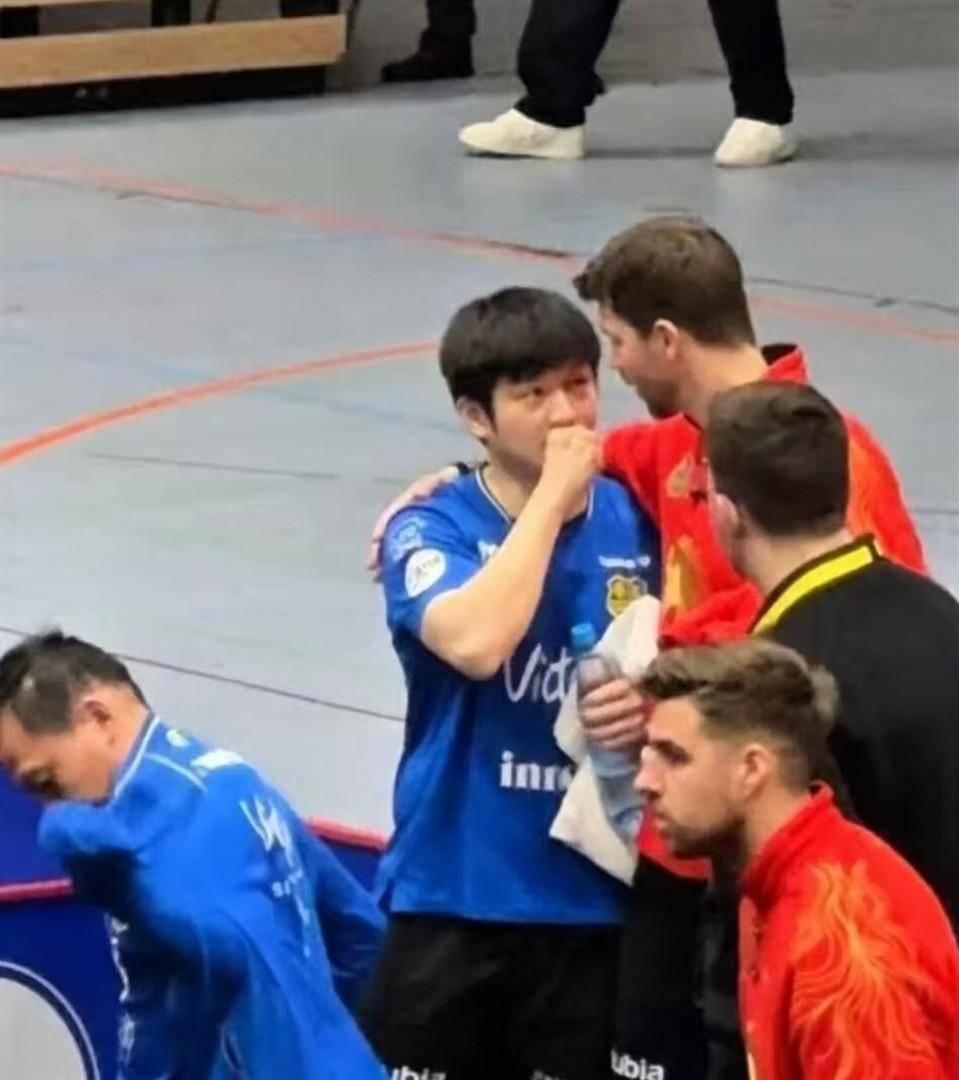 更令人揪心的是樊振东的场外细节。 整场比赛多次出现他匆忙上阵的画面——灰色运动裤腰带上挂着晃荡的衣角,蓝色训练服下摆时而垂落膝头。 每当镜头扫过教练席,总能捕捉到他倚靠挡板凝视记分牌的侧影。 队友巴鲁瓦上前勾肩搭背开玩笑时,他挤出礼节性笑容,嘴角弧度却不及眼底光亮。 队长弗朗西斯卡屡次试图活跃气氛,樊振东也只是点头应和。